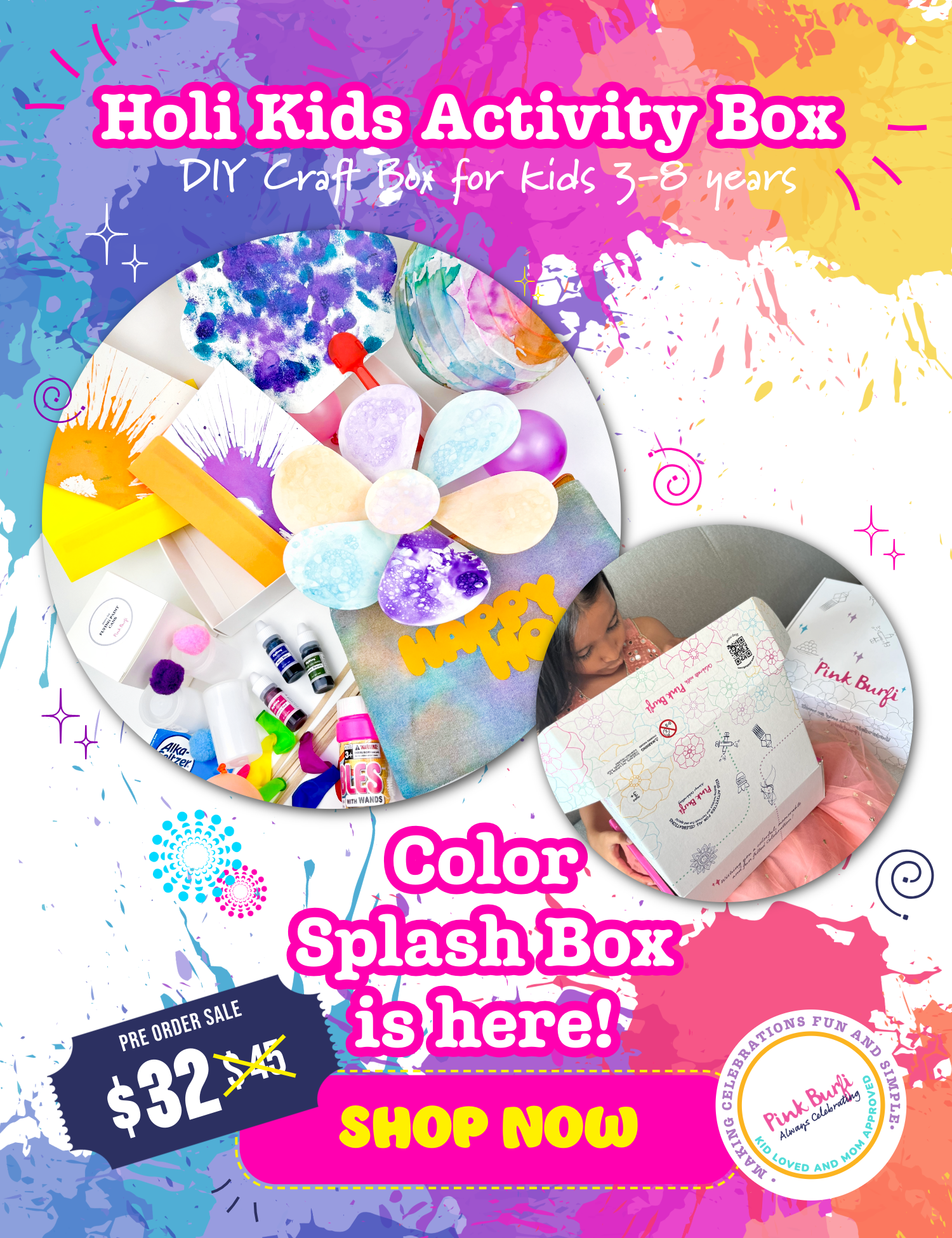 Are you looking for fun and creative ways to celebrate Indian culture with your family and friends? Do you wish there was an easier way to incorporate Indian culture and traditions into your kid’s typical play day? Are you constantly scrolling on Pinterest for kid’s Indian crafts? If you answered yes to any of these then Pink Burfi is your one stop shop for all your Indian kids arts and crafts needs. Designed by a busy working mom, all activities are designed keeping in mind the convenience of not having to spend hours planning, shopping, or preparing. Everything is ready to go and the smallest of detail is thought through, which sometimes even includes packing a tiny bottle of glue! All activities are designed keeping in mind varied skill levels and interests, with the ultimate goal to educate our little ones while they learn about all things Indian.