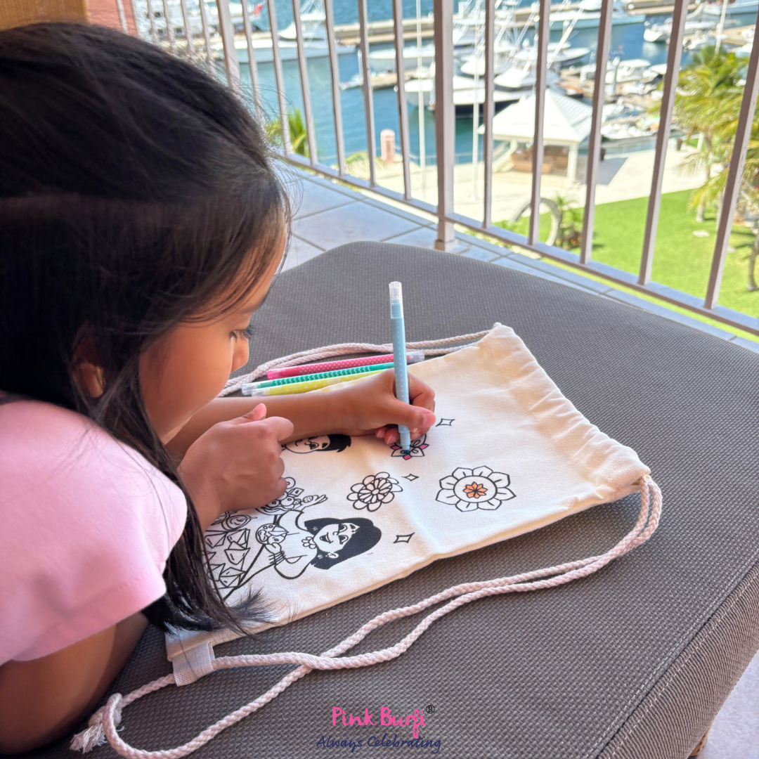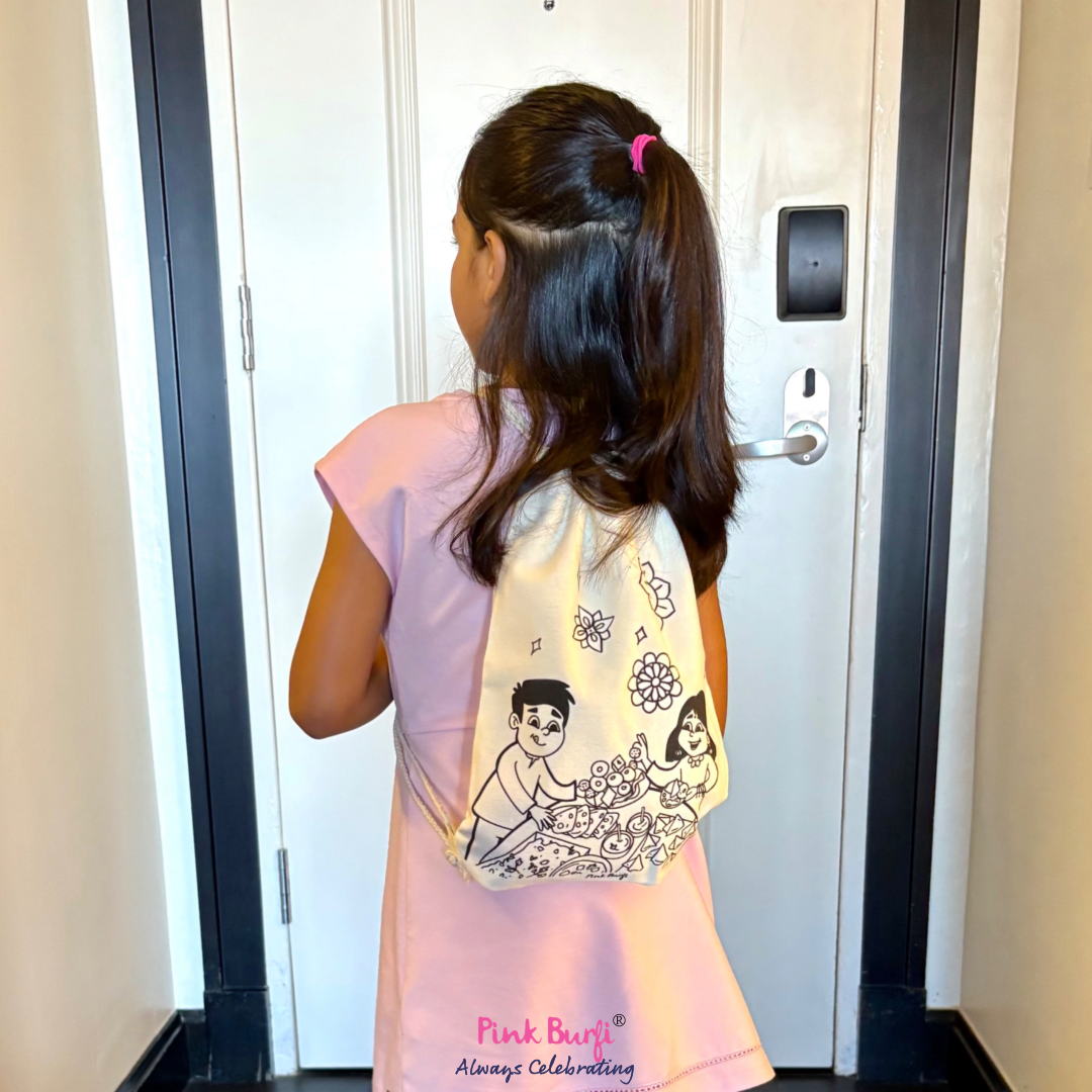Made for little artists, this drawstring bag can be colored using washable markers - wash and reuse for endless fun! It's a delightful way to keep kids engaged during family gatherings, festivals, or even as part of a cultural learning unit.