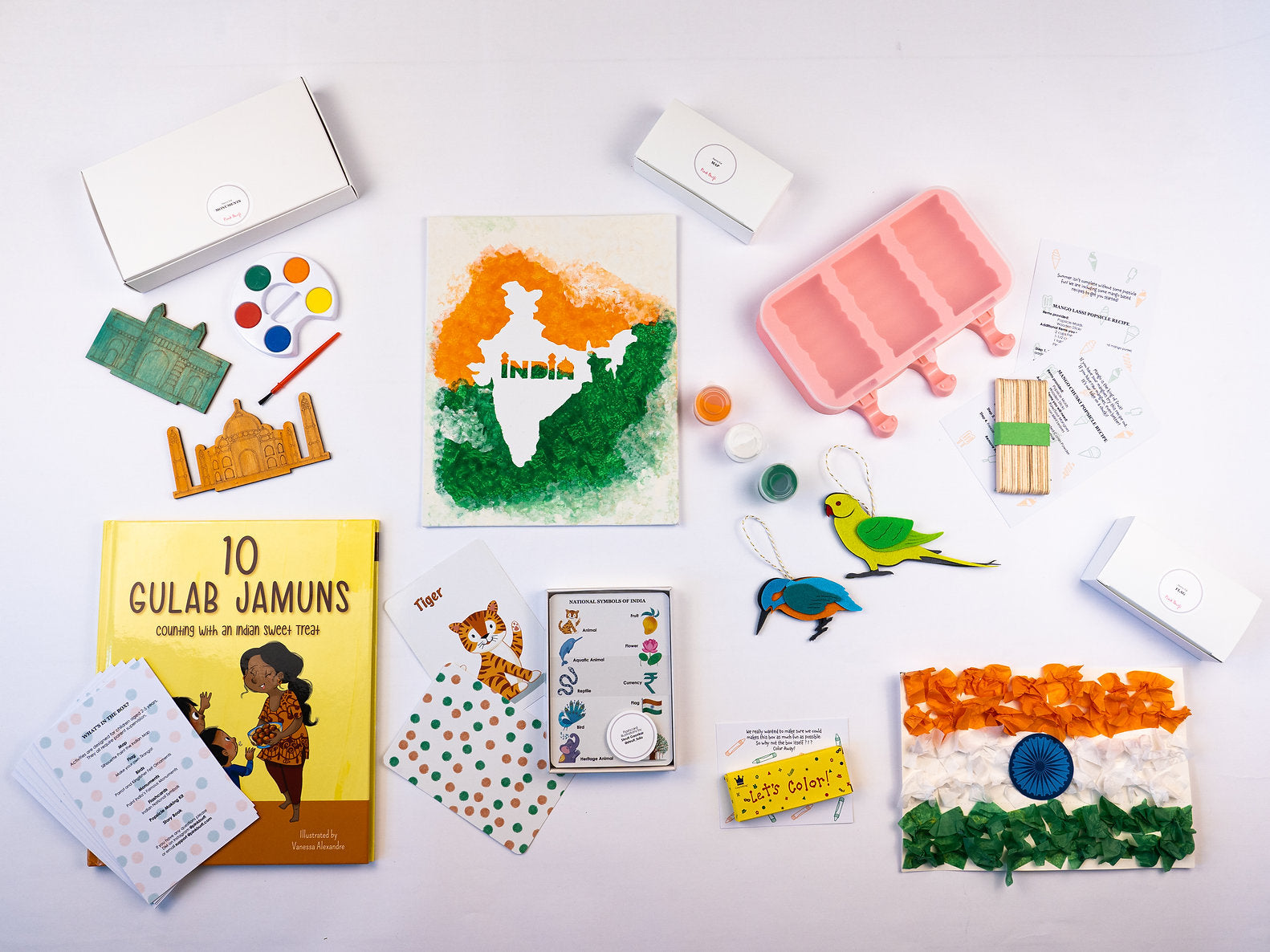 The India Box is the perfect way to introduce your kids to the beauty of India! This box contains a variety of crafts and activities that will let your kids explore the country, including the Indian flag, map, and famous monuments. The flashcards beautifully illustrate the Indian national symbols and can be used for a fun game of memory and matching. The 10-Gulab Jamun book is a fun read for kids all ages. Use the popsicle making mold to re-live your own childhood memories with some mango pop recipes included. Let your kids explore the wonders of India without ever leaving their doorstep.